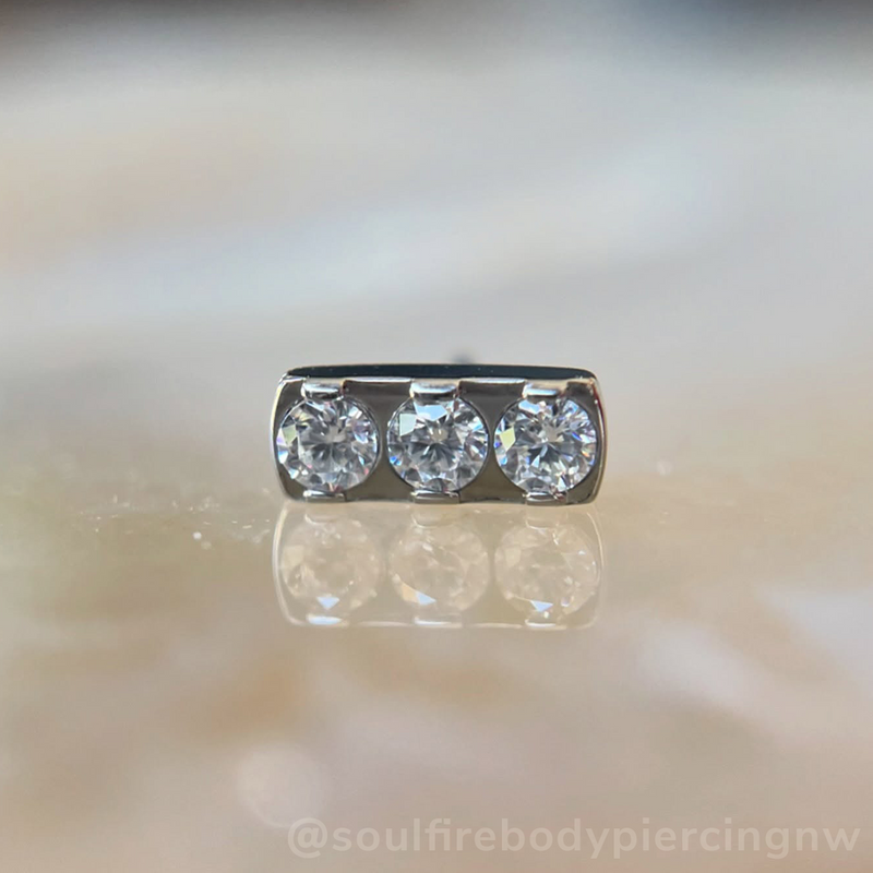 Our Titanium Gem Bar is perfect for any occasion. Crafted from a single piece of implant-certified titanium, this threadless end features a choice of 3 or 5 sparkling 1.5mm CZ gems for a subtle yet stylish shine. Stack this bar with other gems or wear it on its own for an understated look.