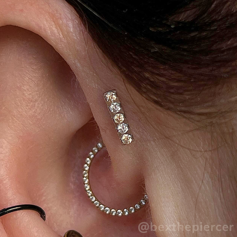 This festive threadless end, crafted from a single piece of implant-certified titanium, features a row of 3 or 5 sparkling 1.5mm CZ and champagne gems that catch the light in all the right ways. Perfect for stacking with other jewelry or wearing solo, this piece brings a touch of seasonal sparkle to any look.