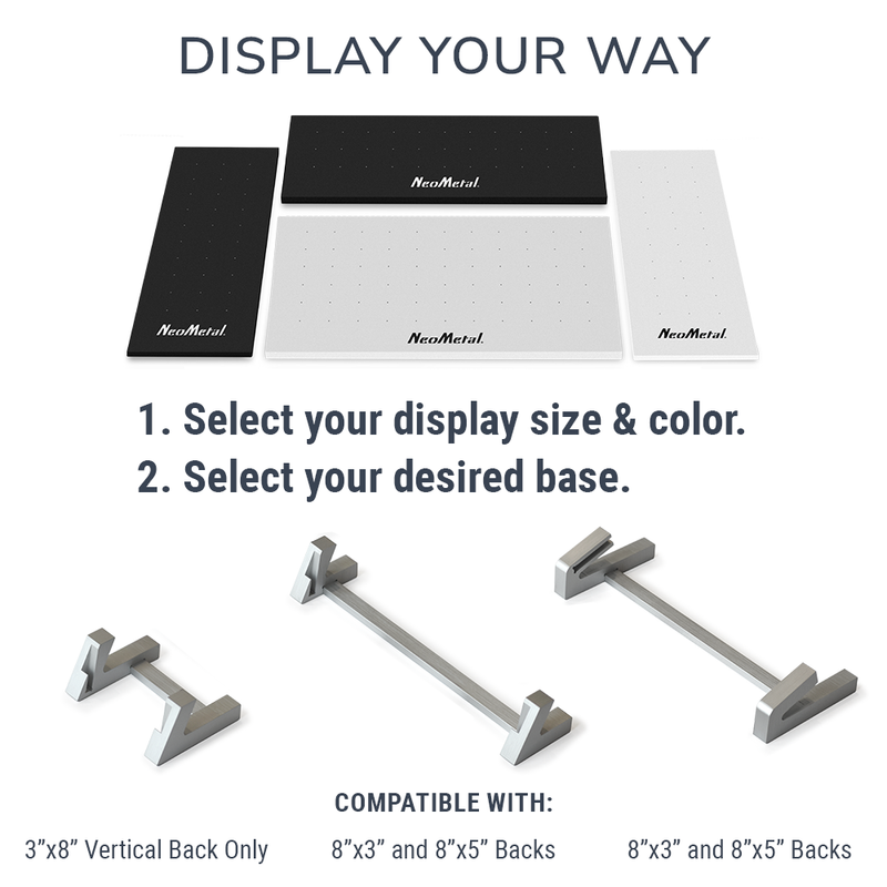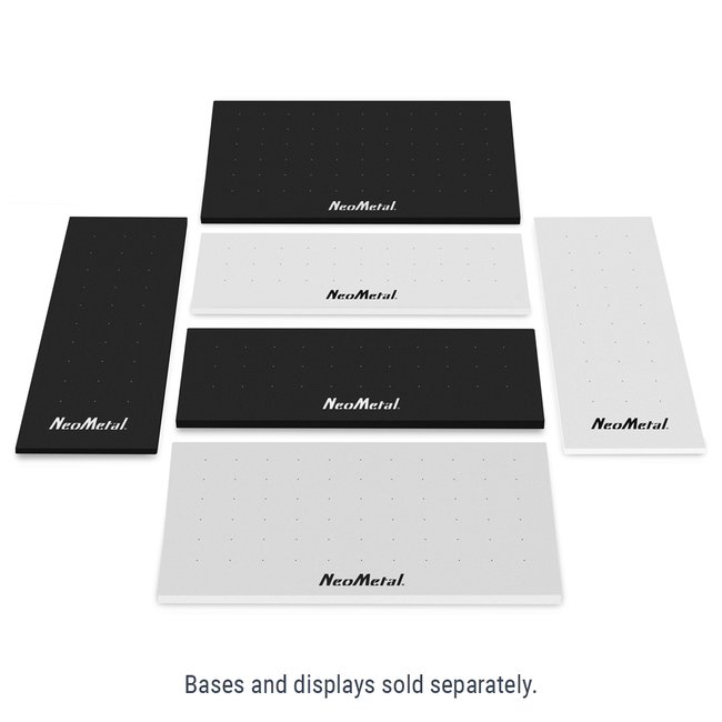Our premium jewelry displays are designed to elevate the presentation of your NeoMetal jewelry. Each display is crafted from a 5mm thick acrylic backing in white or black, adorned with the NeoMetal logo. **Note: Display stands sold separately.