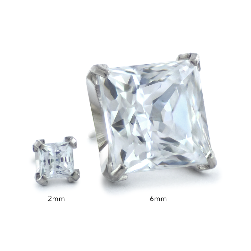 Our princess cut gems are prong set in a custom-designed titanium setting. The angular four-point prong setting provides a stunning contrast to the elegant sparkle of the princess cut gem.